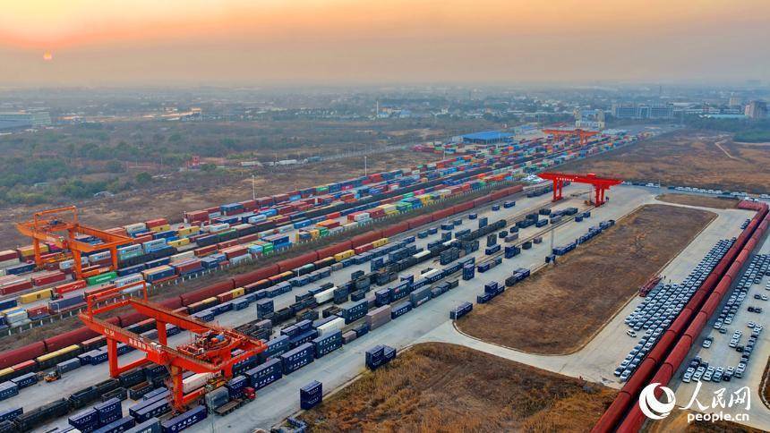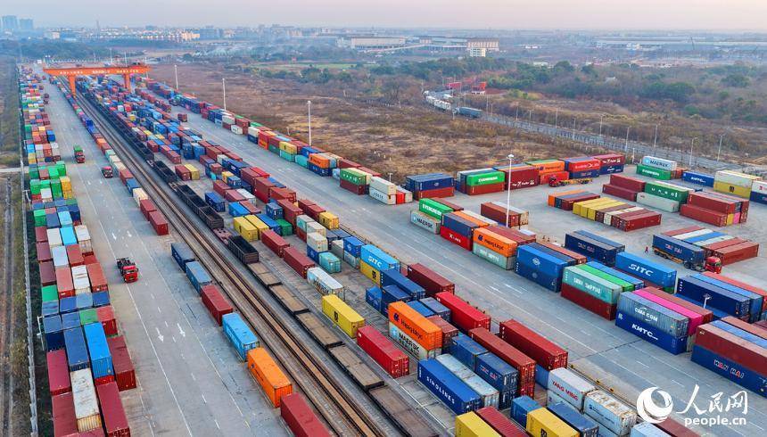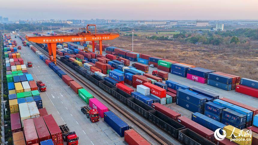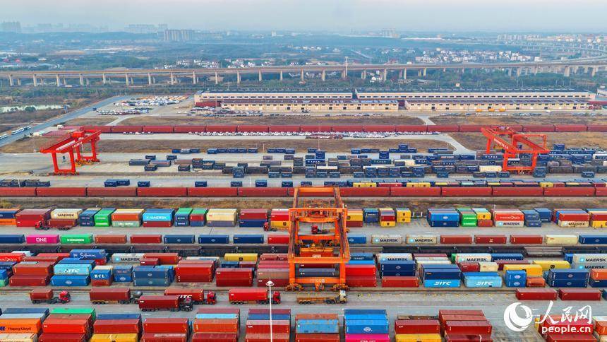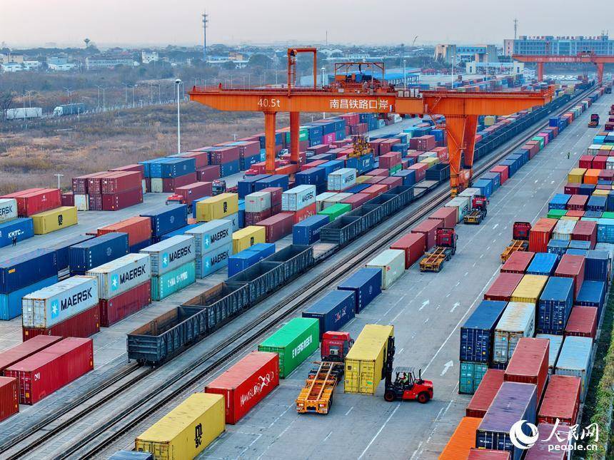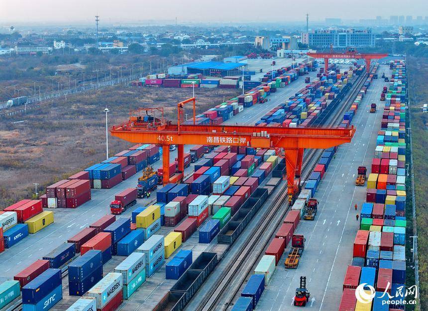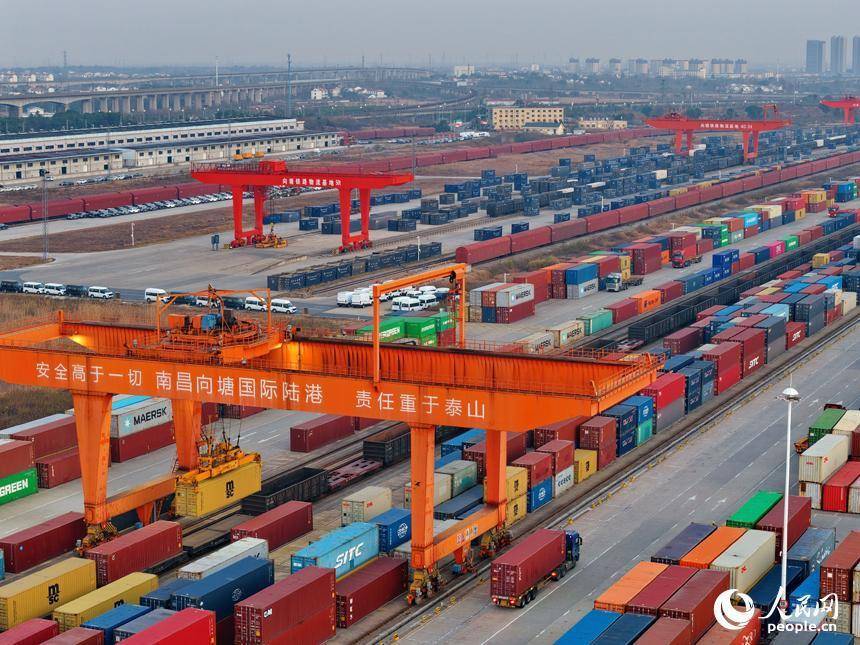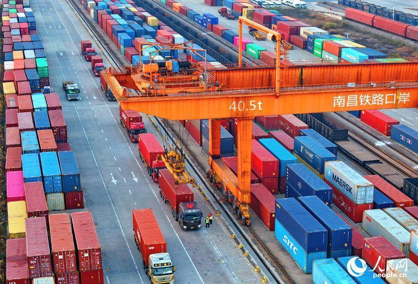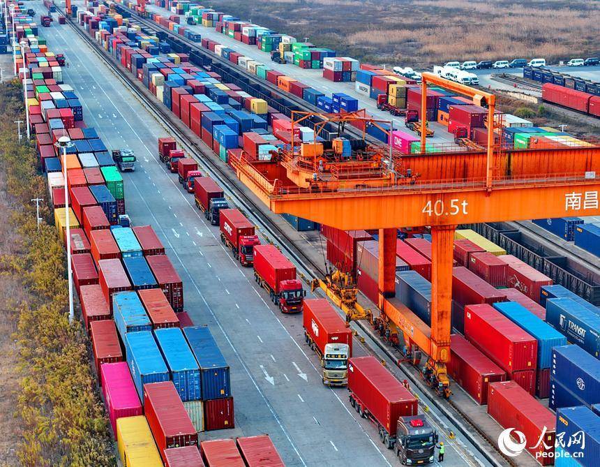 南昌国际陆港货运场站内,货物集装箱装卸有序进行,运输车辆往来穿行。人民网记者 朱海鹏摄人民网南昌1月12日电 (记者朱海鹏)近日,位于江西省南昌市南昌县的南昌国际陆港货运场站内,货物集装箱装卸有序进行,运输车辆往来穿行。